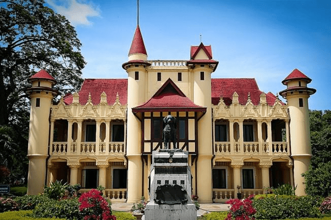 อาคารขนาดกลางสีชมพูอ่อน ทรงโรมันแบบยุโรป เป็นสถานที่ประทับของสมเด็จพระศรีพัชรินทราบรมราชินีนาถ - ศาลากลางน้ำ และ สะพานขาวโค้ง